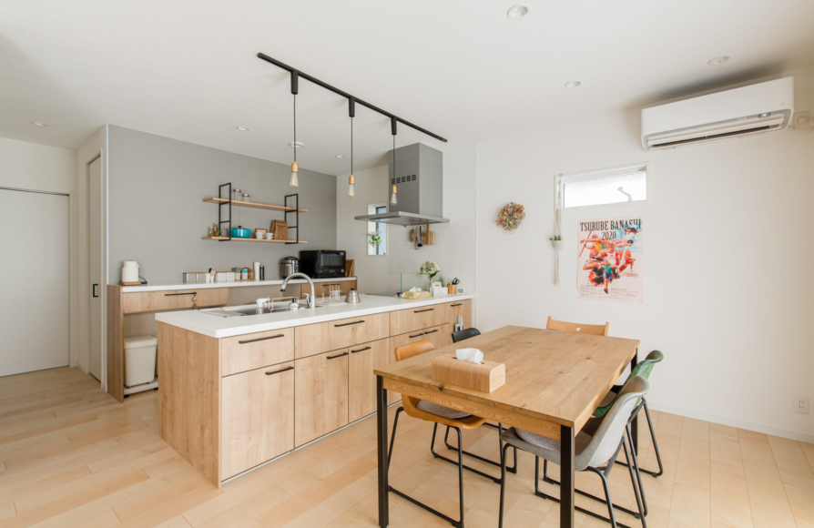 奥様にとってキッチンは献立を考え料理をして後片付けするなど、一日の中で一番長く居る場所になります。多くの家事をこなさないといけない戦場だからこそ、好きなモノに囲まれた少しでもテンションが上がる空間にしようと奥様と話し合いコーディネート させていただきました。立ち上がりのないフラットなキッチンはお手入れがしやすく、子供たちと一緒にピザづくりやお菓子づくりをしやすいキッチンです。 背面の壁のアクセントクロスは何色にしよう?ペンダントライトはどんな可愛い形にしよう?飾り棚には何を飾るかな?など、お気に入りの空間になることをイメージしながら楽しく仕様設備の打合せをしました。